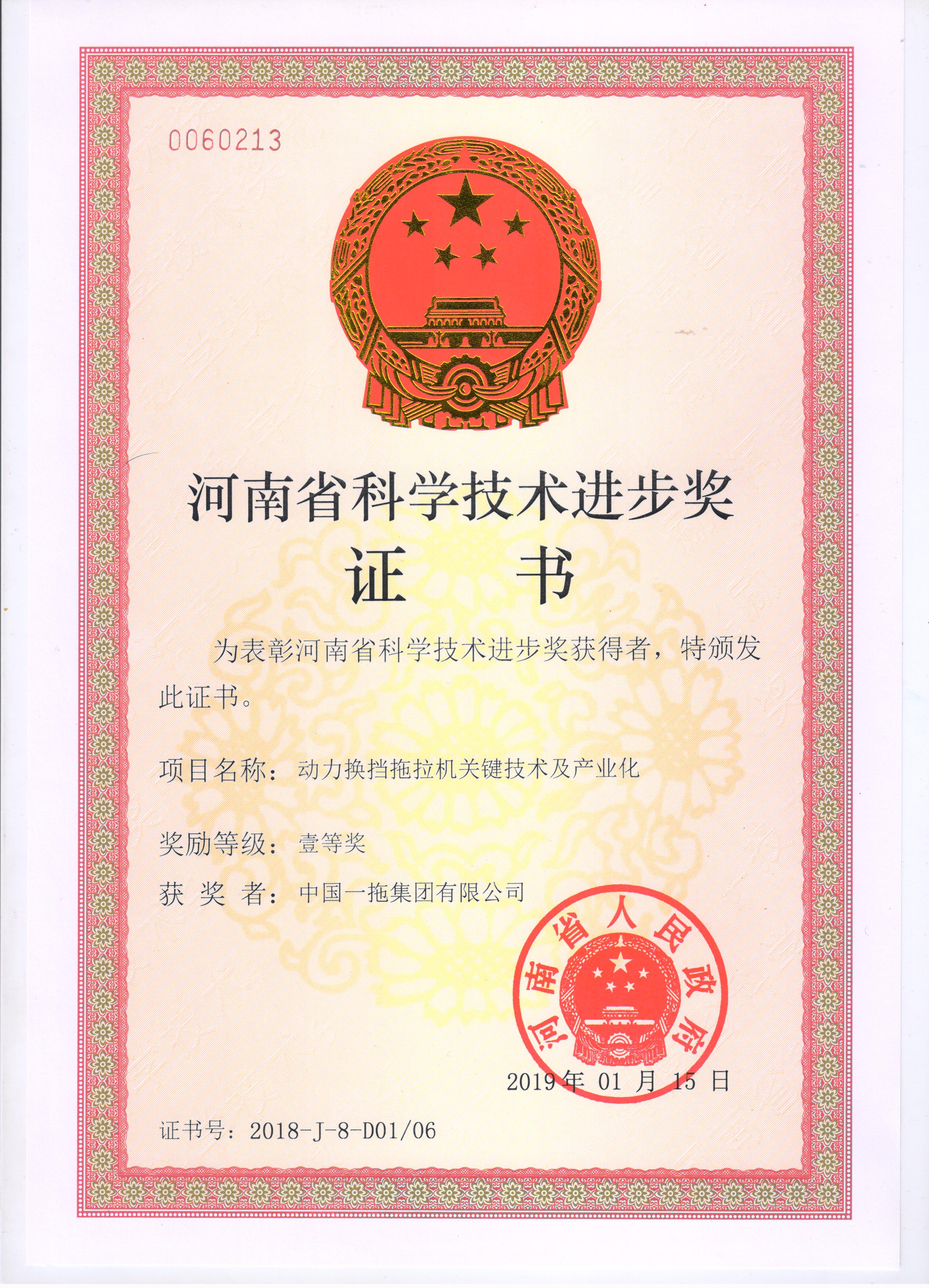 2019年1月中旬,河南省人民政府公布了《關(guān)于2018年度河南省科學(xué)技術(shù)獎勵的決定》,中國一拖申報的《動力換擋拖拉機關(guān)鍵技術(shù)及產(chǎn)業(yè)化》項目獲得河南省2018年度科學(xué)技術(shù)進步獎一等獎,王東青、馮春凌、薛志飛、康健、葛便京等15名科技人員榜上有名,喜獲河南省人民政府簽發(fā)的獎勵證書。